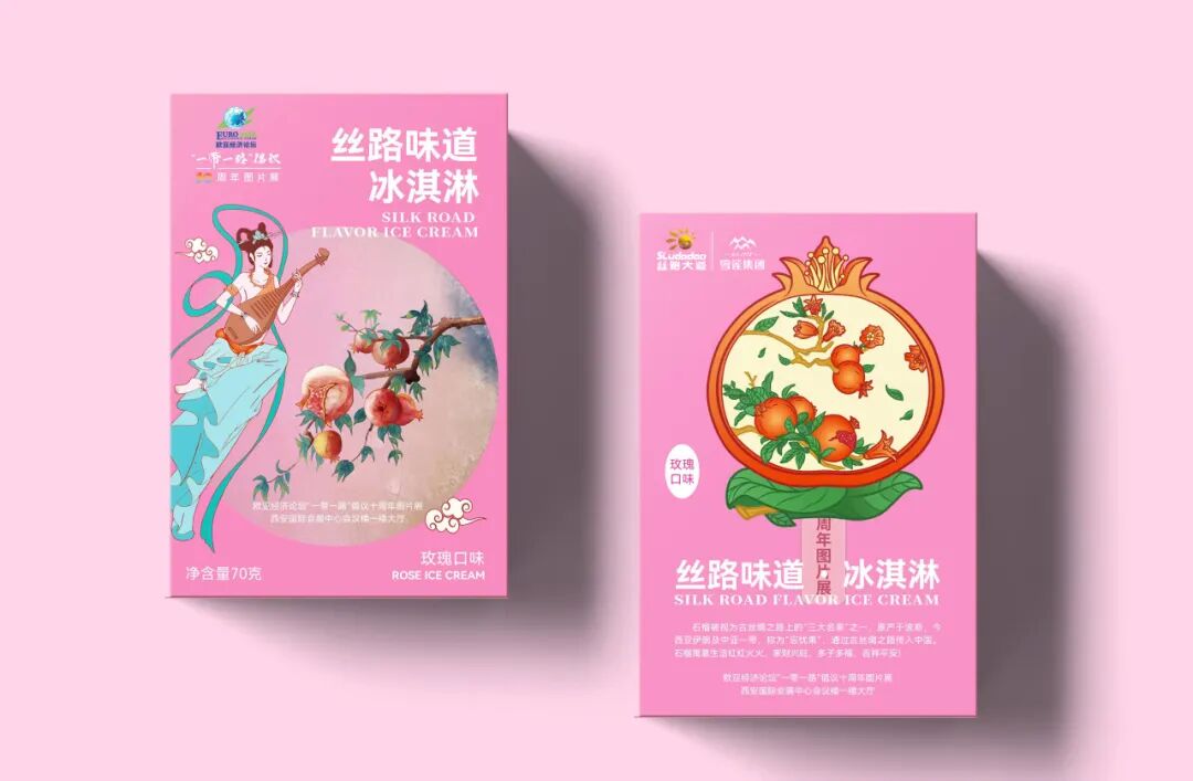 丝路味道冰淇淋以西安市市花——石榴花为创意点,石榴窗花图案+石榴外形的结合设计,造型独特精美。石榴形玫瑰味的丝路味道冰淇淋,采用新鲜驼奶、稀奶油、新鲜玫瑰等优质原材料制作而成,不添加任何香精、防腐剂,玫瑰清香加上醇厚的奶味一同交织在味蕾中。